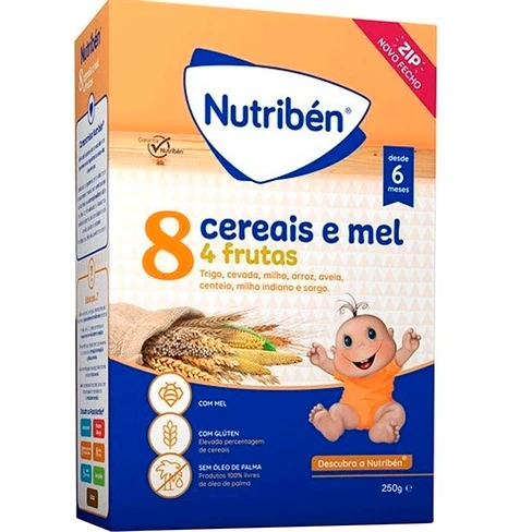 Nutribén Porridge 8 Cereals Honey and 4 Fruits—a delightful blend of cereals, fruits, and honey for babies 6 months and older. Balanced nutrition, naturally sweet!